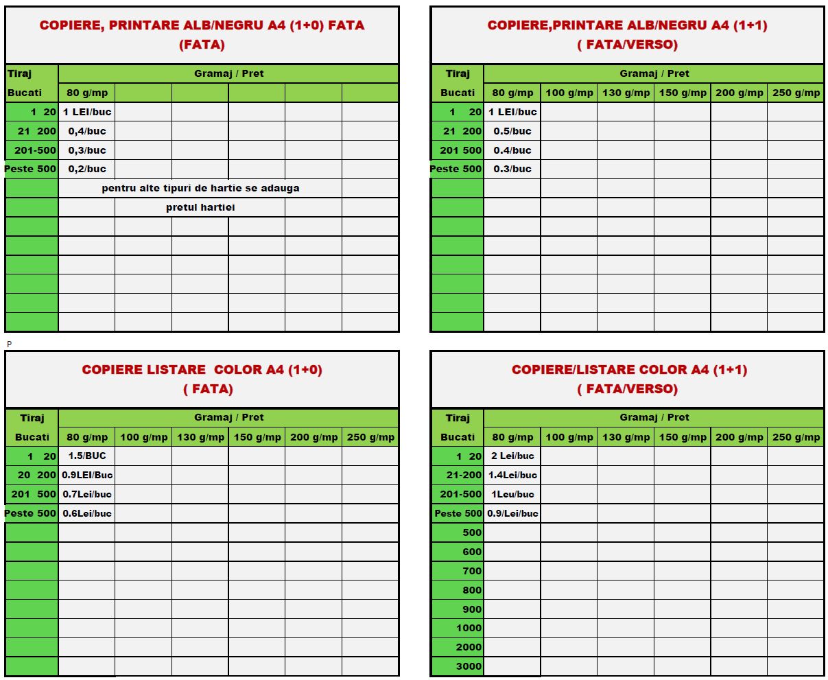 Prețul va fi calculat în funcție de cantitățile / tirajul și dimensiunile produselor finite.